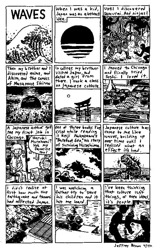 A global response to the combined disasters of the tsunami, earthquake and nuclear meltdown that occured in Japan in March, 2011. Over 35 contributors from 5 continents including Jeffrey Brown, Noah Van Sciver, Carrie McNinch and Ben Snakepit share their thoughts and feelings about Japan. The proceeds from this book will be donated to relief efforts in northeast Japan
